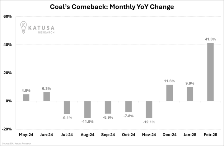 Coal isn't dead – it's making a comeback. U.S. coal-fired generation jumped a shocking 41.3% year-over-year in February.
