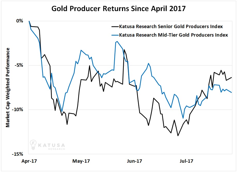 ***Regular readers will recall my writings on the oil patch back in June. At the time, I stated that although the oil and gas sector had suffered massively in 2017, more pain was on the way. Last week’s declines show that my expectations are being met. They are also moving us closer to a significant bottom in the oil sector. I’m getting closer and closer to pulling the trigger on high-quality names marked down to discount prices. More on this to come.How Index Funds Are Impacting the Gold SectorOver the past seven years, index funds and exchange-traded funds (ETFs) have dominant forces in the market. Typically, these funds don’t try to beat the market. They are the market. They own broad indexes (like the S&P 500) or sector groups (like retail or energy). And they’ve become widely popular with investors.Index funds are so popular that many investors are warning about the effects index funds are having on the overall stock market. Since index funds buy stocks based on an index - not good old fashioned fundamental analysis - they have the potential to make popular, overvalued stocks even more overvalued… and warp the market.What you may not have heard however, is how ETFs are influencing returns in the gold stock sector. Since spring, the smaller mid-tiers (sub 400,000 ounces of gold production annually) have experienced significant selling which we will explain later. This significant selling of the smaller mid-tiers has lowered the overall mid-tier index relative to its performance to the senior index in past years.And still true today, as a group, the mid-tiers overall are cheaper than the senior gold producers.The chart below is the Katusa Senior Gold Index which is made up of the 15 global publicly listed primary gold producers that produced over 1 million ounces of gold in 2016. The senior golds have outperformed the Katusa Mid-Tier Gold Producers which is made up of 25 publicly listed primary gold producers that produced between 250,000 and 1 million ounces of gold in 2016.