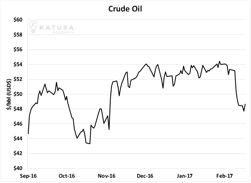 . It’s an 11% decline in value in just a few weeks. It’s a huge short-term move that shocked many people.But should you be surprised oil has dropped below $50 a barrel?Not if you’ve been reading Katusa Research for a while.Back in October, I published my thoughts on the oil market that differed from the conventional wisdom at the time. At the time, many oil market players had turned bullish because OPEC announced a major production cut. It was the first time OPEC had attempted a production cut since 2008. The promise of reduced supplies sent oil prices 5% higher on the day of the announcement.I didn’t share the market’s giddiness. I noted that while OPEC’s announcement made for a good media soundbite, it wouldn’t lead to higher oil prices over the long-term. I said oil would likely hit a ceiling in the $55 per barrel area. That’s exactly what has happened.  Below is a chart for the price of crude oil since the OPEC announcement.